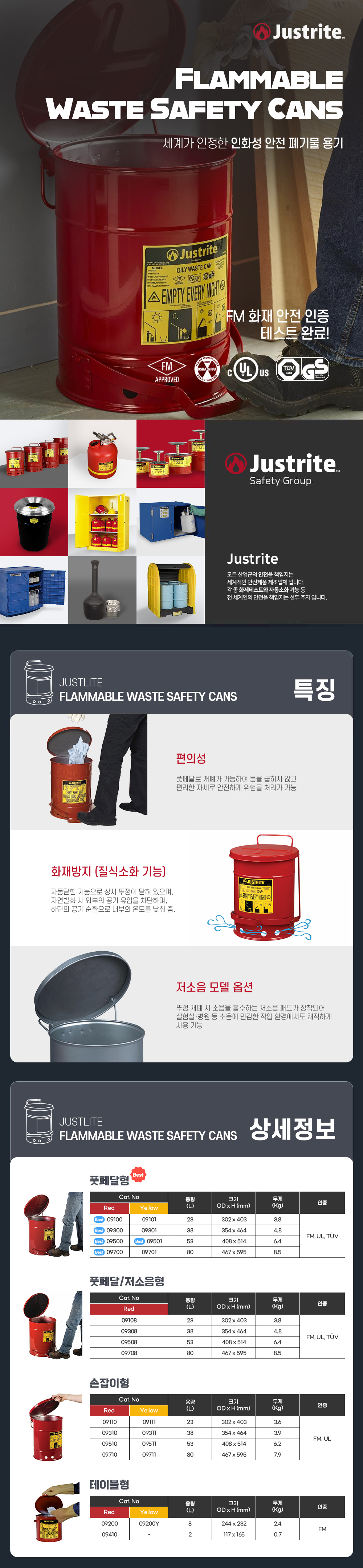 • Justrite 09501 / FM인증 폐기물 안전보관통 14갤런 풋페달형 (철제/53L/노랑)/OD 408x514mm/6.4kg[1EA]